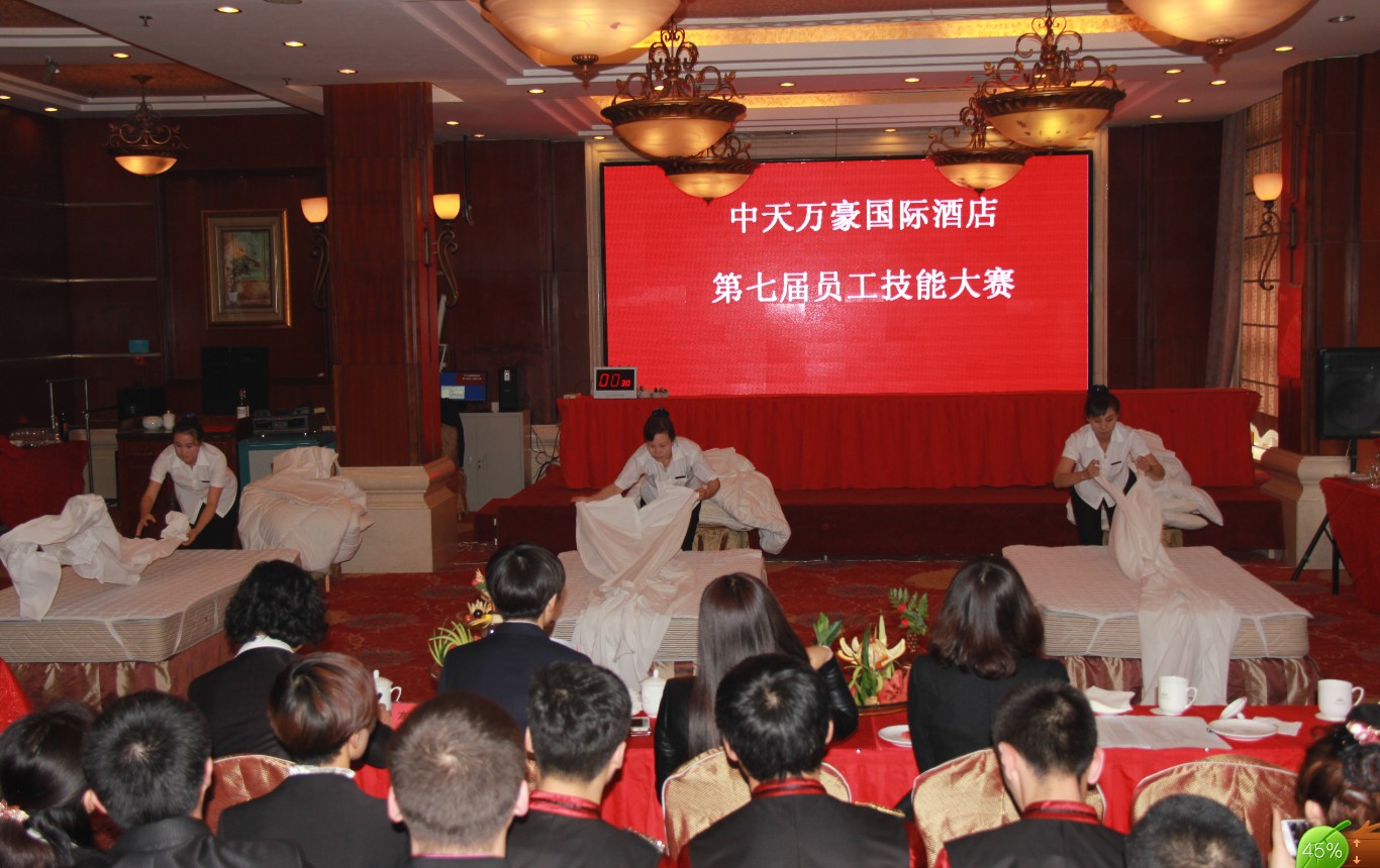 中天萬豪國際酒店一年一度的技能大賽,是檢驗酒店員工業(yè)務(wù)技能水平的一個平臺,是擇優(yōu)選拔技能高手的一次練兵,也是深入貫徹規(guī)范服務(wù),全面提高員工業(yè)務(wù)技術(shù)水平及綜合技能的一項重要舉措。11月21日下午,中天萬豪國際酒店第七屆員工技能大賽在碩果累累的深秋拉開了帷幕,由餐飲部、客房部、前廳部、娛樂部、財務(wù)部、保安部和工程部選派的85名選手參加了比賽和技能演示。酒店總經(jīng)理于洪波、副總經(jīng)理高子洋、職業(yè)技術(shù)學校董娜老師、酒店副總經(jīng)理高子洋出席了比賽現(xiàn)場,并擔任評委,酒店副總高子洋在賽前致辭。