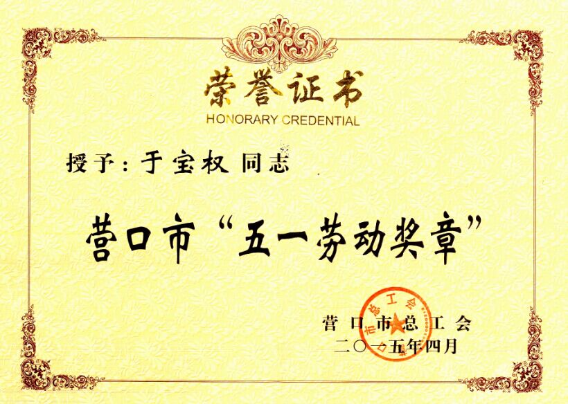在五一國際勞動節(jié)來臨之際, 4月28日上午,市總工會召開的2015年營口市“五一勞動獎狀”和“五一勞動獎?wù)隆北碚么髸?,于寶?quán)董事長榮獲“市五一勞動獎?wù)隆笔鈽s;4月29日上午,在站前區(qū)政府召開的“站前區(qū)勞動模范先進(jìn)集體表彰會”上,于洪濤總經(jīng)理榮獲“站前區(qū)勞動模范”殊榮。所獲得的殊榮是市政府、區(qū)政府對兩位領(lǐng)導(dǎo)者多年來兢兢業(yè)業(yè)工作、不斷奉獻(xiàn)社會的稱贊;也是對我們中天集團(tuán)十四載風(fēng)雨兼程,穩(wěn)健發(fā)展的充分肯定。