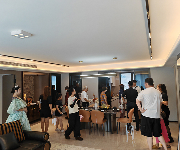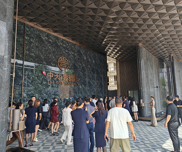 儀式現(xiàn)場,熱情高漲的客戶早已匯聚于這座流光溢彩的東大門前。以名貴理石精工筑就、星空頂熠熠生輝、水幕墻靈動瀉玉、噴泉水系恭迎貴賓的“星幕尊邸門”,其本身即是歸家尊崇儀式的開篇序章,成為令人矚目的視覺地標。人群中,既有開盤即購房的業(yè)主,滿懷憧憬前來借鑒設計靈感,為未來愛家描繪藍圖;亦有眾多意向濃厚的準業(yè)主,翹首以盼親身體驗升級品質(zhì),為理想生活尋覓最契合的空間載體。